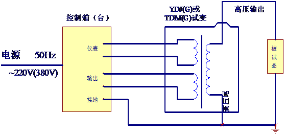 把電源輸入有過流自動脫扣及防止突發加壓的零位連鎖裝置的操作箱,經自耦調壓器調節電壓輸入YDQ-J試驗變壓器初級繞組,根據電磁感應原理,在次級(高壓)繞組按其與初級繞組匝數之比可獲得同等倍數的電壓幅值-工頻高壓。
