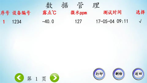 點擊“返回”,儀器返回到“功能選擇”。在“功能選擇”界面選擇“數(shù)據(jù)管理”,進入“數(shù)據(jù)查看”界面,如下圖所示。可以在此界面查看以前保存的數(shù)據(jù)。