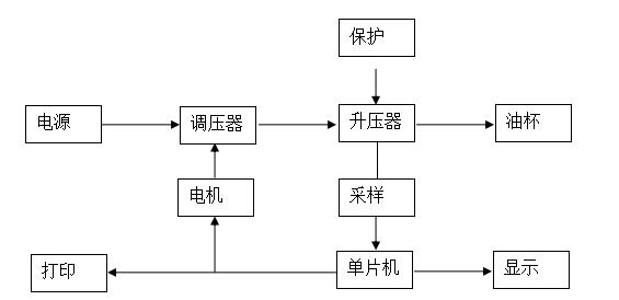 油試驗(yàn)的交流高壓電壓從調(diào)壓器的輸出經(jīng)過升壓而得,硬件保護(hù)電路可以識(shí)別油樣是否被擊穿,油樣擊穿時(shí)保護(hù)電路通過硬件自動(dòng)截?cái)嗌龎浩鞯妮斎?,同時(shí)單片機(jī)控制步進(jìn)電機(jī)使調(diào)壓器返回到零位。調(diào)壓器的升降過程和儀器的升壓速度都是由單片機(jī)根據(jù)具體的試驗(yàn)程序控制步進(jìn)電機(jī)的旋轉(zhuǎn)來實(shí)現(xiàn)的。在整個(gè)升壓過程中一起顯示油杯中電極之間所承受的電壓值,單位為kV,并把發(fā)生擊穿前瞬間的電壓值作為試油單次試驗(yàn)的擊穿電壓。