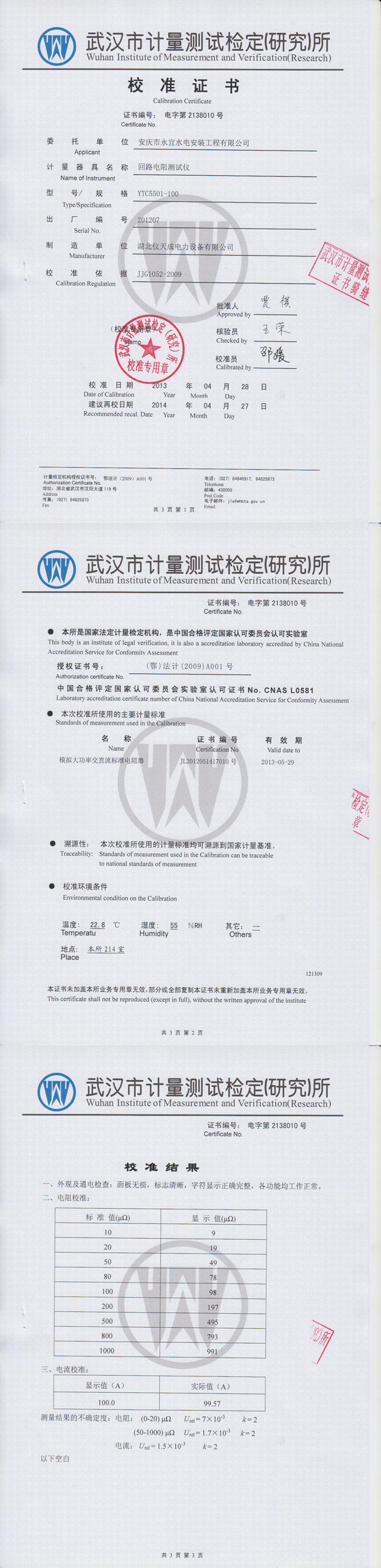 轉載:"YTC5501-100回路電阻測試儀資質證書" 請注明來源于儀天成電力。 更多技術問題請致電儀天成電力客戶服務:027-87876585,技術部專線:027-87876585,在線客服:719388481
