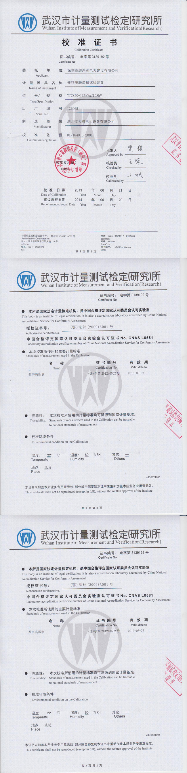 轉載:"YTC850系列變頻串聯諧振試驗裝置資質證書" 請注明來源于儀天成電力。 更多技術問題請致電儀天成電力客戶服務:027-87876585,技術部專線:027-87876585,在線客服:719388481